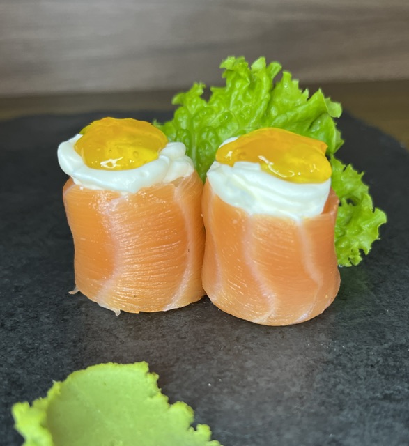 | Enrolado de salmão,com arroz,Creem Cheese,cebolinha. |