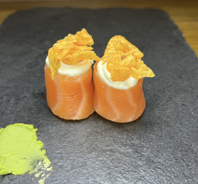 | Enrolado de salmão,com arroz, Creem Cheese e Doritos |