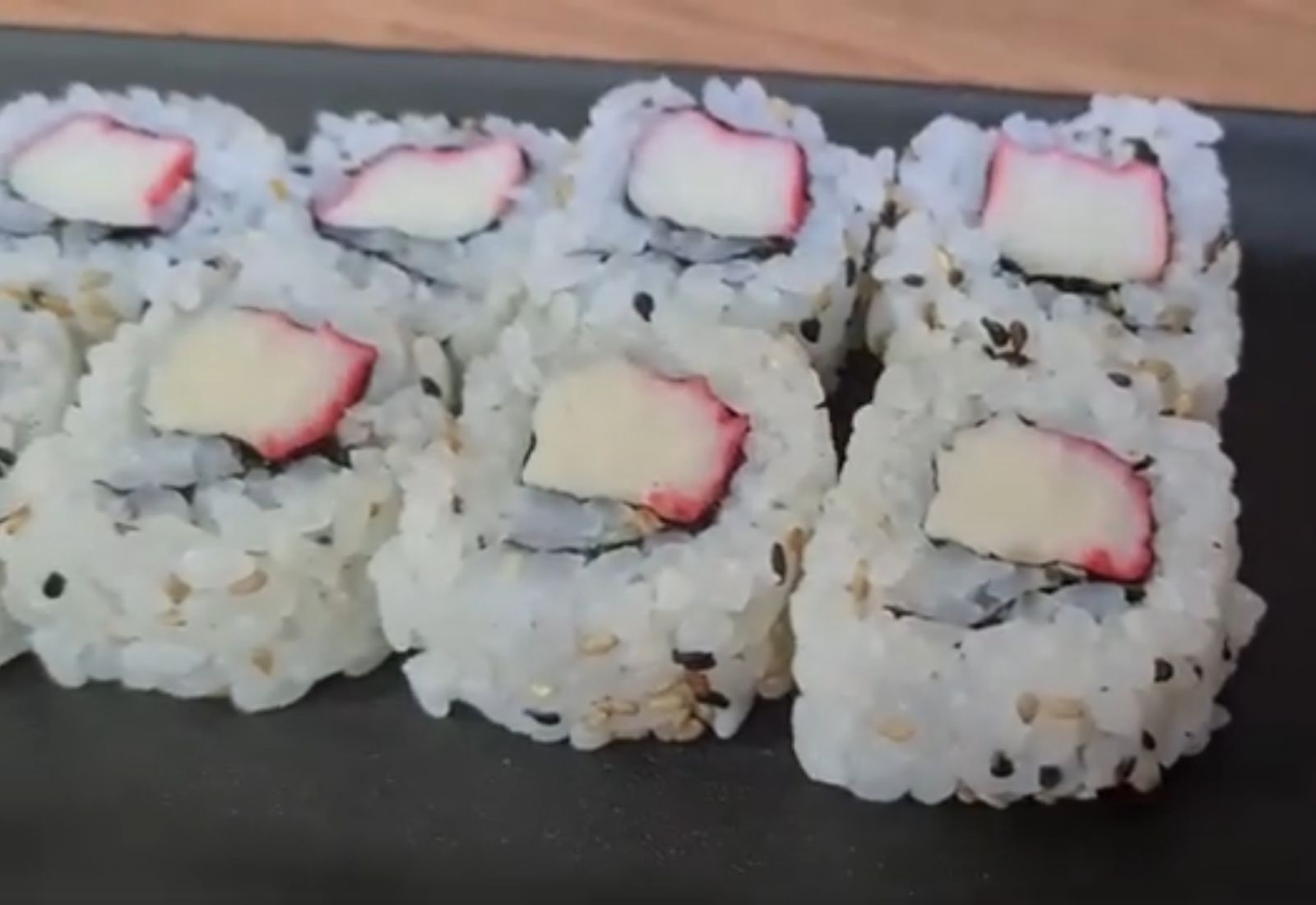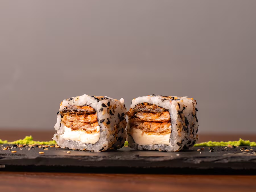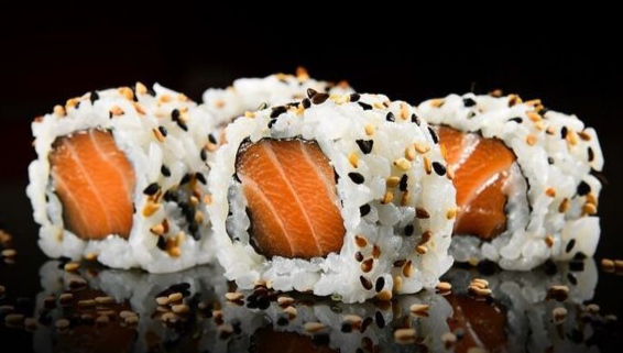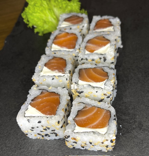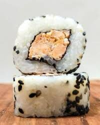 | Arroz, alga, salmão, cream cheese, gergelim branco e preto torrado |