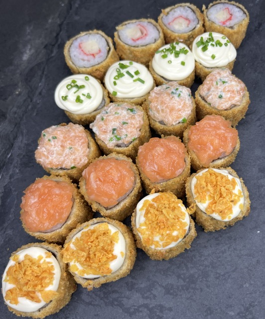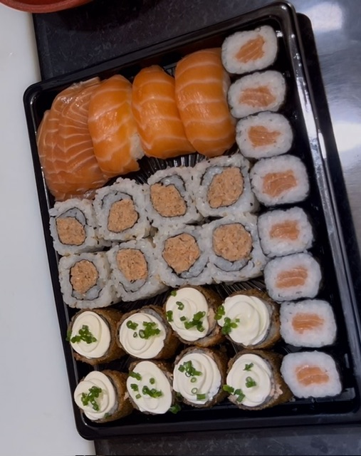| 2 Joy Philadelfia, 2 Niguiri Salmão,2 Niguiri Skin, 8 Uramaki Salmão Grelhado c/ Pimenta Biquinho, 4 Hot de Doritos, 4 Hot Philadelfia |